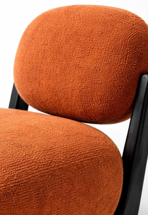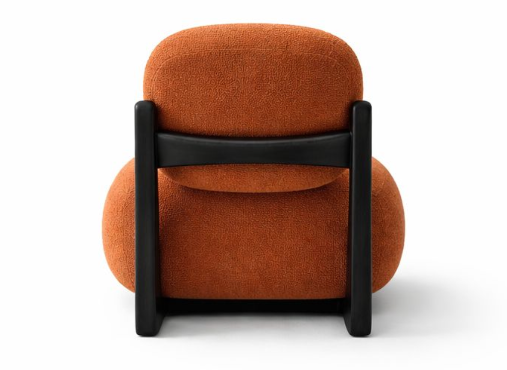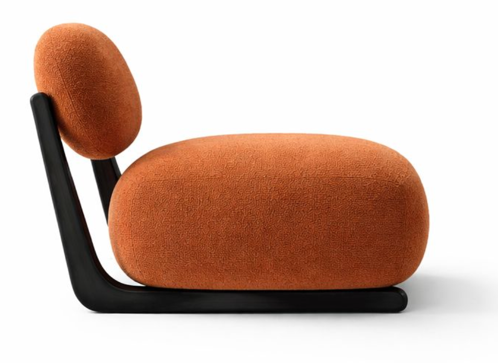 This contemporary lounge chair features a bold, sculptural silhouette with plush, rounded cushioning upholstered in soft textured fabric.