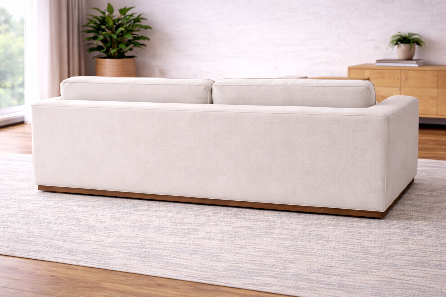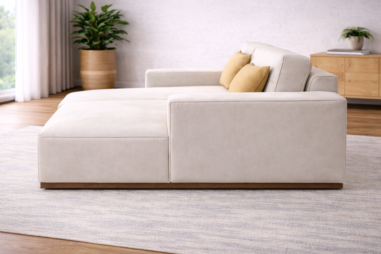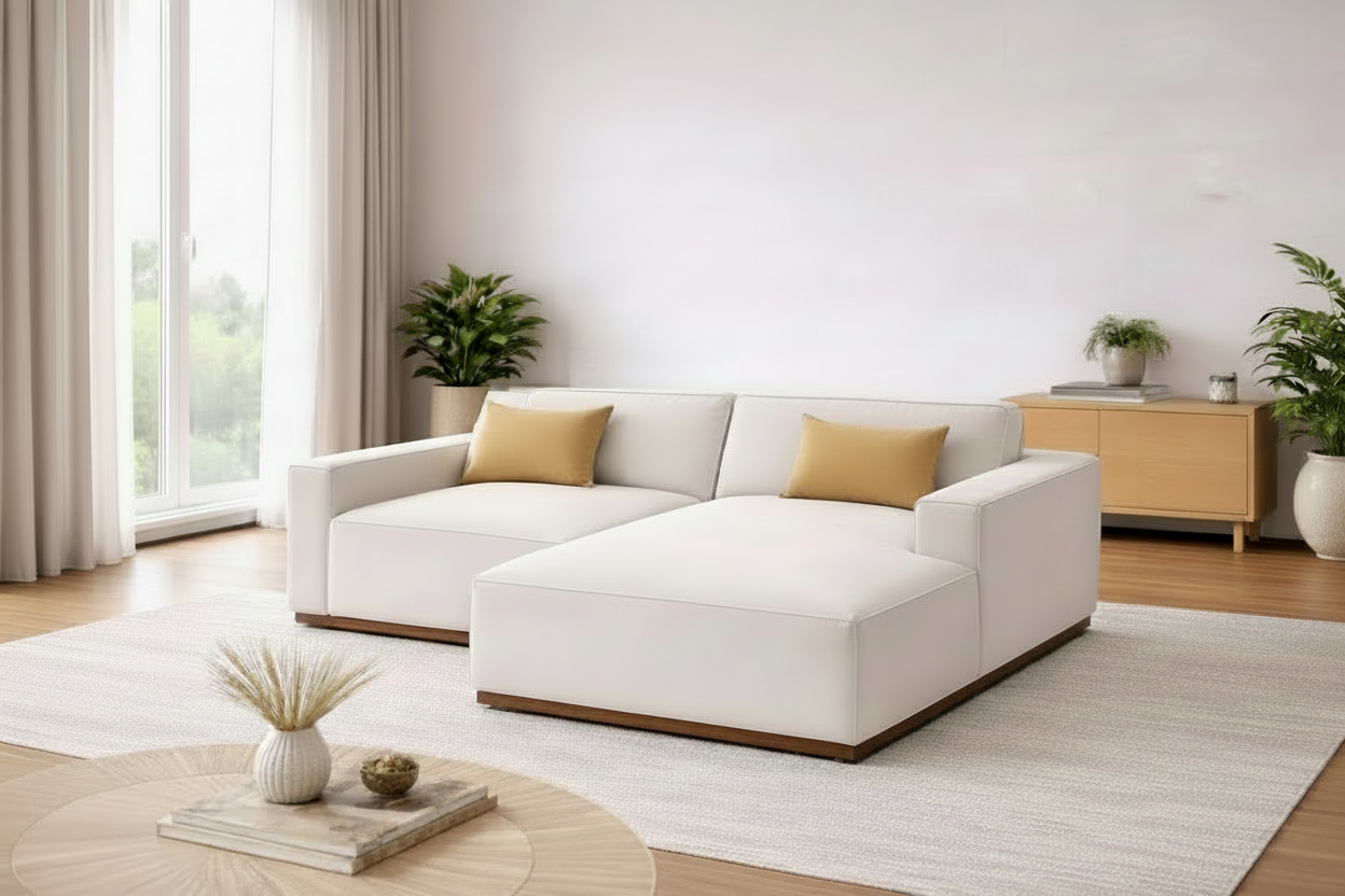Upholstered in premium textured fabric, this piece showcases refined appeal.The design is beautifully grounded with a wooden skirting detail, bringing natural warmth and a touch of craftsmanship to the silhouette. This lounger sofa is perfect for a tv room or a cozy living room
